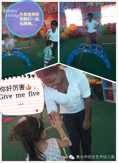 外教共享 感统魅力 新学期初外教珍老师又来到了我们阳光艺术幼儿园总园和我们大三班的小朋友共同参与了好玩的感统课程,看孩子们和外教老师玩得多开心啊! 通过我们的感统训练不仅提升了孩子们的各项技能,而且通过外教的加入让孩子们在生活中接受学习领略了外语的奥妙,真正把外语作为一种交流的工具运用到生活中,在活动中让孩子们学会了许多日常口语,提高了孩子们的英语表达能力。 想让您的宝贝免费和外教学习吗?快来我们衡水阳光艺术幼儿园吧! 报名热线:0318——7102511 7087316