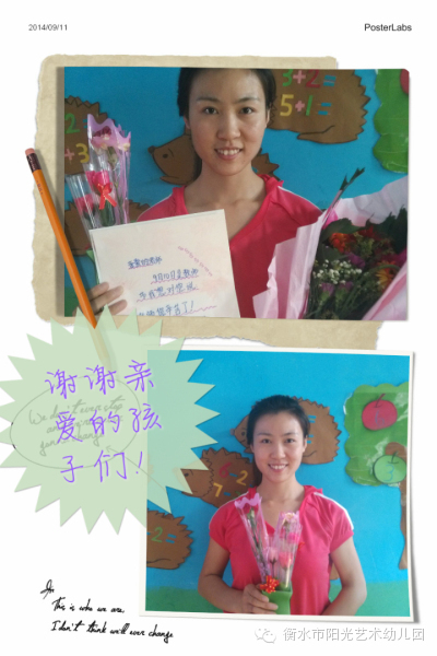 9月10是我们最可爱的老师们的节日,在此我们也再次祝我们的老师们节日快乐!在这一天孩子们也在用她们的方式送上了她们对老师的祝福,有的宝贝早起一来就大声对老师说“节日快乐”;有的宝贝给老师献上一个个甜甜的吻;有的宝贝还为老师送上一朵鲜花,或一张贺卡;更有的宝贝自己为老师精心画了一幅画,并写上了自己的祝福……这一切都让我们心里暖暖的,谢谢我们亲爱的宝贝们,你们是老师骄傲和自豪,老师爱你们!
