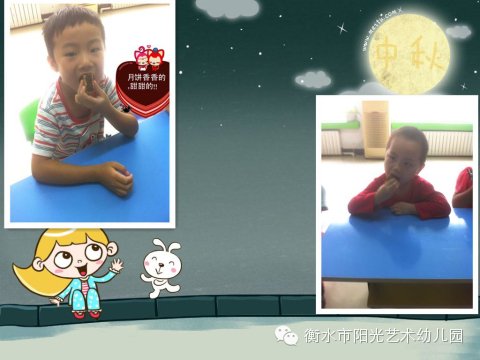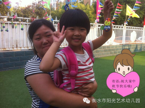 为了让宝贝们美好的度过这个节日,衡水阳光幼儿园特为宝贝们开展了“快乐过中秋”活动,这次活动主要让幼儿知道阴历八月十五是中秋节,简单了解中秋节的来历,知道中秋节又叫团圆节。了解中秋节人们的活动,通过幼儿品尝月饼、和家长一起手工制作,绘画等形式,体验过节的快乐,感受中国传统的文化习俗。下面就去阳光四幼体验一下他们的“快乐中秋”吧!!