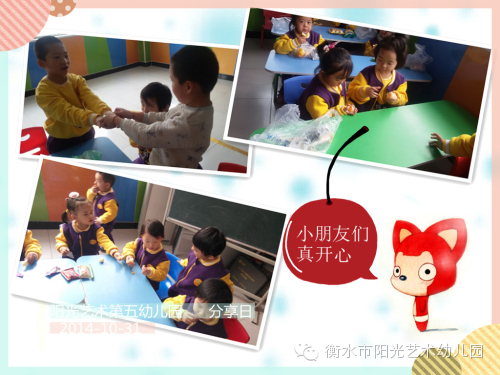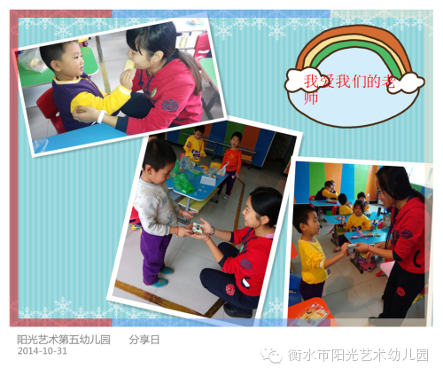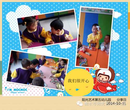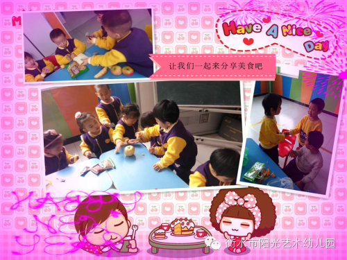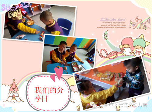 在分享日这一天,孩子们从家里带来一些好吃的点心、水果等等。在老师的组织引导下,孩子们在班内和小朋友互相介绍自己的食物,大家一起玩,一起吃。此项活动,使孩子们相亲相爱的一起学习和生活,增进了孩子之间的情感,培养了孩子们“好东西只有与大家分享才能更快乐”的意识,增强了孩子们之间的社会交往能力。
