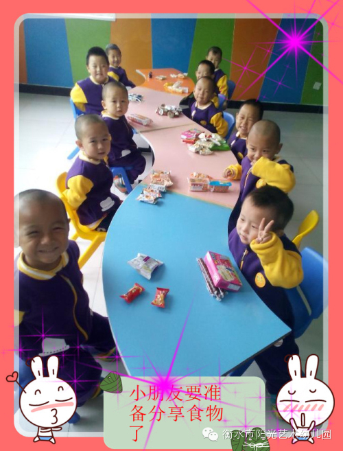 现在,幼儿园幼儿多数是独生子女,他们往往任性而又缺乏社会交往经验。为了培养孩子与人交往,乐意与人分享的意识,增进孩子间的情谊,使他们喜欢幼儿园,喜欢和同伴玩耍、学习,阳光艺术幼儿园定于10月30日在班内开展 “食物分享日”活动。