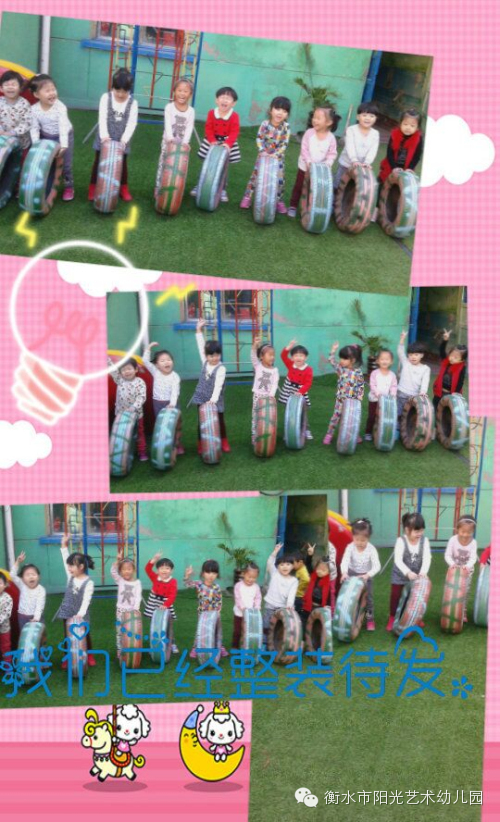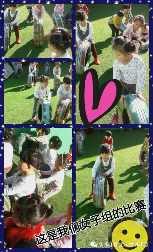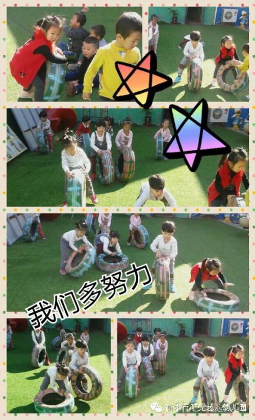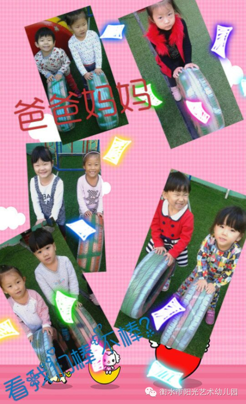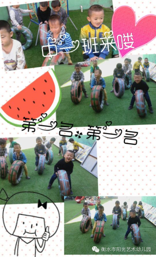 谜底揭晓了,原来是《轮胎滚动大比拼》。“轮胎”是孩子们都比较熟悉的一样东西,为了使孩子们能在玩中得到快乐,善于发现并亲身体验,宣扬废旧利用,增强幼儿的环保意识,老师特别设计了《轮胎滚动大比拼》的游戏活动,让孩子们在探索的过程中发现轮胎的多种玩法,并培养他们与人合作的意识。让宝贝们体验到创造的乐趣,敢于创新,增强自信。
