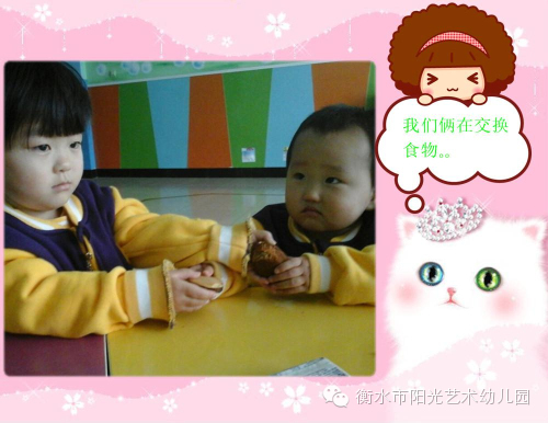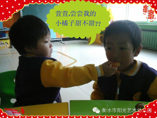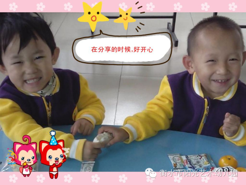 未来社会在强调个性张扬自我表现的同时,更注重团队合作及与人相处的能力。而我们的幼儿缺乏分享意识和交往能力,一切以自我为中心、独占精神成为了形成良好社会性发展的很大障碍。孩子的分享行为不是自然形成的,要想让分享成为孩子自觉自愿的行为,成人必须在日常生活中对孩子加以引导。因此,衡水阳光艺术第四幼儿园在2014年10月30日在班内开展了“食物分享”的活动。