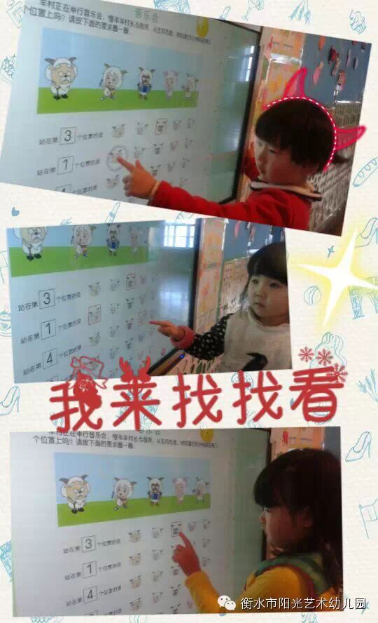快乐的学习是在让孩子游戏中、活动中体验学习的乐趣,我园配备的教学设备:触摸式一体机。使我们的教学方式更加规范化和专业化,也让我们的孩子们可以在学习中获得更多的乐趣! 现在让我们看看总园中一班的孩子们操作一体机的场景吧!