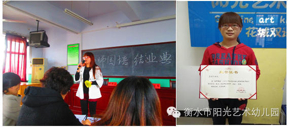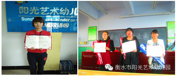 十八、2014年9月13日起至11月2日我们阳光艺术幼教集团各园所共27名教师参加了2014国培活动。11月1日我们参加国培的这些教师圆满毕业,成绩如下:我园郭鹏芳老师荣获了“区角创设”一等奖; 李伟老师荣获“区角创设”二等奖;米晓萌、裴凯园教师荣获“美术手工”二等奖;祁帅、张琪、李丹阳等教师荣获“众说一课”二等奖。