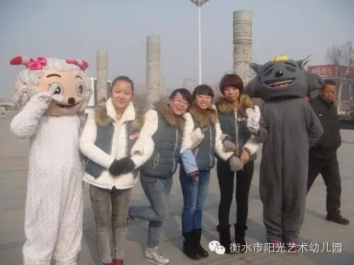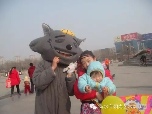 2014年2月14日下午2点至4点半,阳光艺术幼儿园教师身着可爱的卡通服到人民广场、怡水园与可爱宝贝们互动合影!
