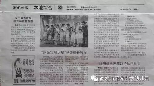 2014年7月7日阳光艺术幼教集团举办的六一颁奖大会活动在衡水晚报报刊登题目为“阳光宝贝之星 见证成长历程”