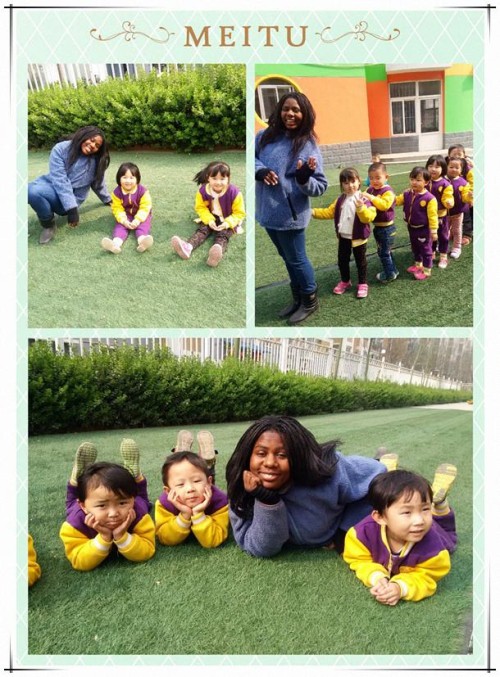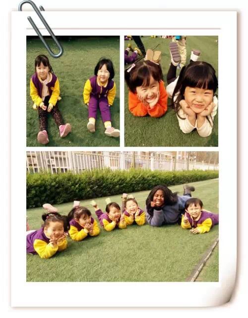 ——哦,原来是外教老师和小朋友们在草坪上做游戏呢!