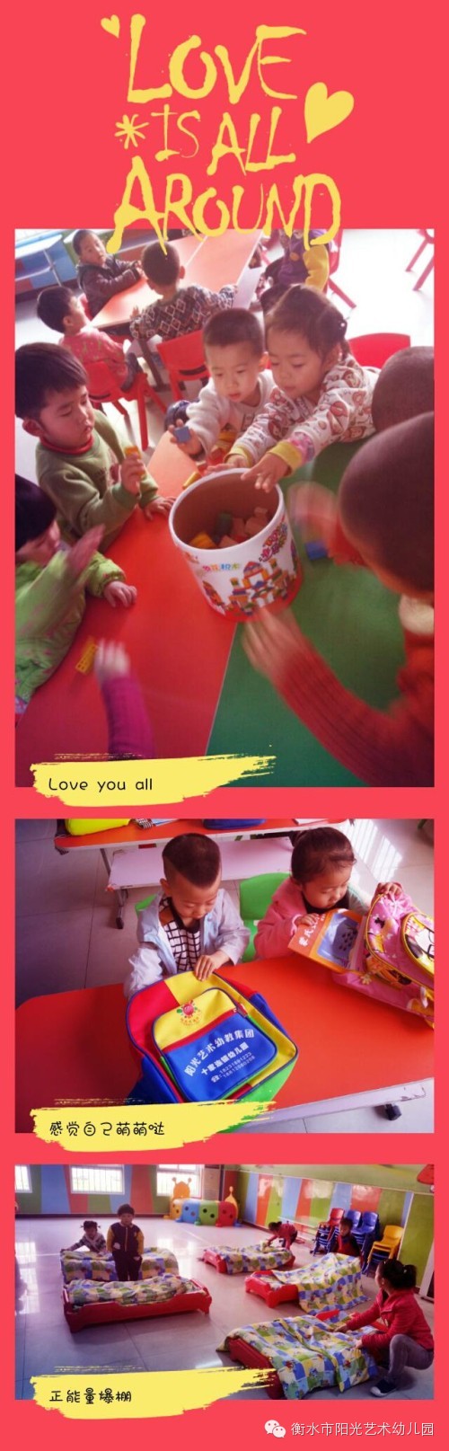 衡水阳光艺术幼儿园,宝贝们最喜欢的幼儿园,在我园老师的悉心照顾下,宝贝们每天都在成长,都在给我们惊喜,因为它们拥有了一双新的小巧手,学会了写字、画画、做手工,特别是今日我们阳光艺术第六幼儿园,为宝贝们上了一日特别的“我劳动,我快乐”的生活课堂,没想到我们的宝贝那么厉害,个个都表现出色,下面就让我们一起看看宝贝们的精彩瞬间吧! 各位叔叔阿姨们,我们的宝贝表现的棒不棒,像不像个小大人呢,如果你也想让你的宝贝快速成长,能够在学习生活上双丰收,那就快快为给你的宝贝报名吧!