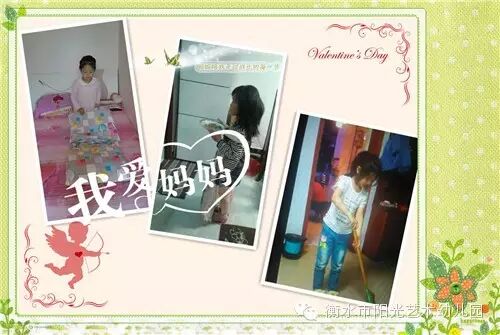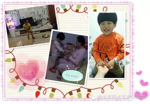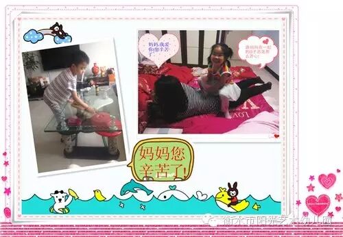 一年一度的"母亲节"马上就要来临了,我们阳光艺术第三幼儿园为了让宝贝们了解到母爱的伟大,进一步增进母子母女间的情感,我们的老师们精心设计了母亲节系列活动。另外我们还给每位小朋友们布置了一个小任务,就是回家帮妈妈做一件力所能及的事情,让他们知道自己的妈妈是多么辛苦,我们要爱自己的妈妈!回到家后我们的小宝贝们都纷纷的做起老师布置的任务,看他们忙活的,有帮妈妈打扫卫生的、有给妈妈、奶奶洗脚的、有捶背的、还有沏茶的,看他们有模有样的做着每一件事情是多么认真,多么可爱啊!第二天我们的妈妈们还把自己的感受写了下来,这一张张卡片上记录的满满都是爱,都是感动,看着宝贝们在一天天的长大,妈妈们的心里说不出来的高兴和欣慰。