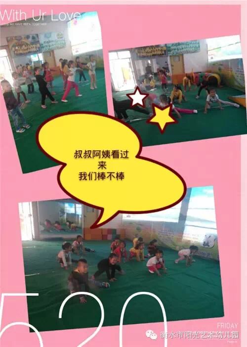 六一儿童节即将到来,我们阳光艺术幼儿园各个园所的小朋友们都行动起来了,为了给自己的节日留下深刻的记忆,也为了让自己体会到更多的活动乐趣,我们的宝贝们都在积极的排练节目,准备迎接她们快乐的六一。 看我们阳光总园的每个宝贝都在很努力的进行排练,宝贝们都想把最优秀的一面展现到我们的舞台上,共同迎接六一儿童节的到来,快来跟随我们的镜头看看这些聪明可爱的孩子吧!