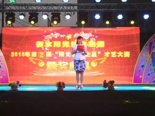 衡水阳光幼教集团“欢庆六一·阳光宝贝之星”才艺大赛颁奖典礼于2015年6月27日晚在胜景茂园广场成功举办,活动现场,小宝贝们再次用他们的才艺表演赢得了观众的阵阵掌上,让我们再一次一起见证宝贝们入园以来的成长,参与文艺汇演,不仅可以增强了宝贝们的自信心和勇气,更能提高宝贝们对活动及才艺的积极性。