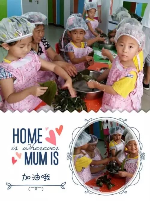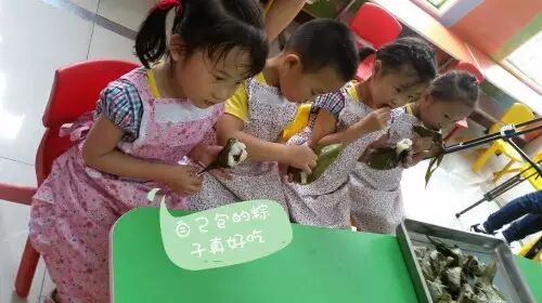 看孩子们都紧张的拿粽叶放糯米放红枣,在队长的帮助下很快就给粽子打好了结,一个粽子就包好了。