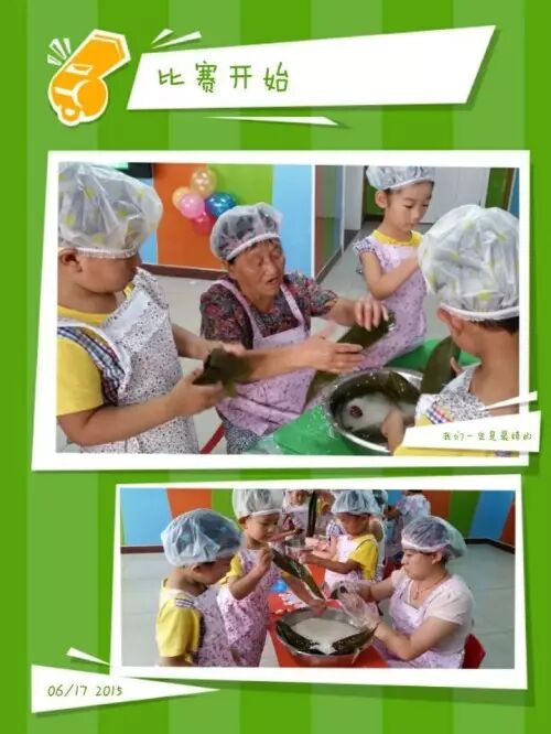 首先,我们把宝贝们分成了五组,每组选一名家长做队长,然后老师为宝贝们介绍了包粽子的方法和要领,随着主持人一声令下,激烈的包粽子比赛开始了。