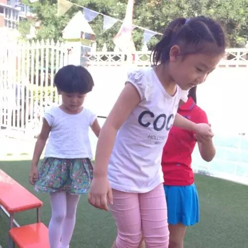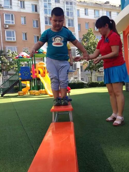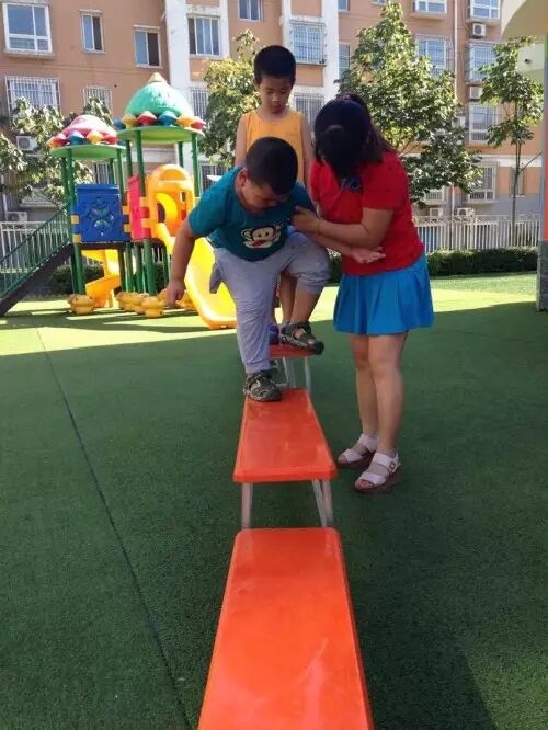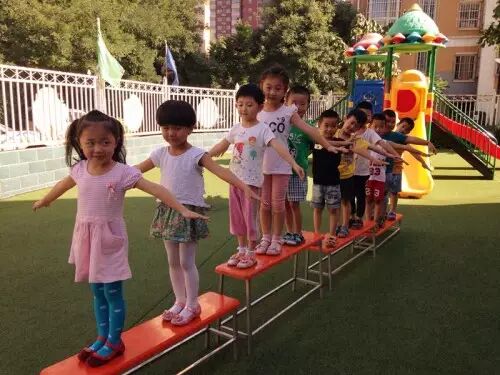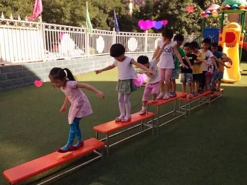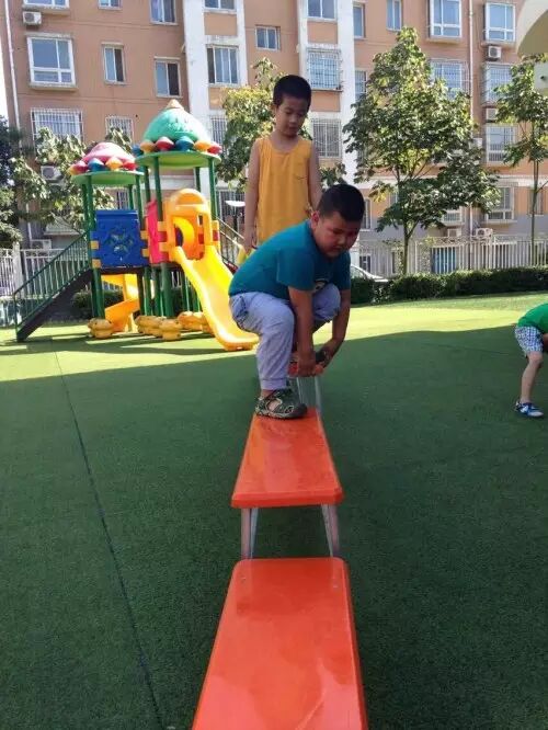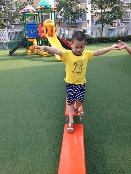 平衡木,真有趣,像座小桥院中立,小朋友,走上去,立刻变成小飞机,摇摇晃晃走过去,回头看看笑嘻嘻,觉得自己有勇气。看小朋友的表现吧!